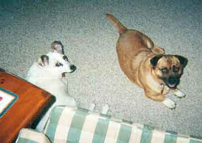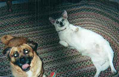 Solomon was adopted into a home with Lucille and proud owners Kate and Mike, who write: Things are going well here. Mike continues to be absolutely stupidly in love with Solomon (as do I, but it's funnier to see it in him). The other day, he (Mike) said, "When I get really wealthy, I'm going to have a little bronze statue of Solomon made so I can put it in my garden." I couldn't make this stuff up if I tried. Also introduced Solomon to my entire family at the cottage last weekend, and he went over very well. Even my brother and sister, who don't like dogs much, were charmed. I left Lucy with Linda because there were 4 small children at the cottage--which turned out to be a good idea. The kids were pretty good, but at one point my 6-year-old nephew tried to jump over Sol and landed on his paw; Sol just yelped and walked away, and I lectured Timmy on respecting dogs, but all I could think was if that had been Lucy, she would have taken a chunk out of Timmy's foot. (And I wouldn't have blamed her, really, but I'm glad I got the opportunity to teach Tim about bugging dogs without having to do first aid.) Anyhow, the marking's pretty well cleared up, he's not testing me too much these days, and he and Lucille are like two peas in a pod, so I'm happy. Any idea when our success story will be up on the website? I want all my friends to be able to see how famous my dog is. :) It's there now =-) Kate continues: I just got down on the floor and had a snuggle with them, and it reminded me to tell you they officially act like they've been together all their lives now. They no longer have any personal space issues--they'll even eat or drink out of the same dish simultaneously. And other people are starting to comment on how they move in unison, the way Lucille and Maxine did, when we're out for a walk. A lot of people have asked if they're brother and sister. (I'd like to see that litter.) No one, least of all me, believes Solomon's only been here for 6 weeks. If ever a dog were truly meant for a particular household, this is it. And... It was fun to read the FAQs and realize he displays so many typical Corgi characteristics. The way he sleeps, the weird noises he makes... I've still only heard him bark a couple of times, but when he wants me to wake up in the morning, he makes this hilarious grunt-yowl noise. As for Lucy, I think whatever Corgi's in her is pretty well buried, but there are definitely a few things--like frantically sprinting across the living room at night for no apparent reason--that fit. Mike and I call these her psychotic episodes--she runs back and forth, apparently convinced something strange is going on, giving little teeny woofs every few seconds. She invariably does it after thunderstorms (we've had a lot recently), and has done it a few other times. Maybe she senses the change in the environment, or she just gets brave after the storm is over, or she just has a lot of energy after cowering behind the toilet all day, I don't know. (It's funny, I mentioned the toilet thing to my parents, and they told me one of the dogs they had before I was born used to hide there, too. I don't know why that feels safer to her than under the bed or in my lap, but at least it's apparently not as weird as I thought.) Anyhow, all goes well here. My only problem with Sol is that he does like to mark, so I have to watch him like a hawk when I take him into a new building. (And I can't leave things lying on the floor in the house, because he'll pee on them. He's already hit every wastebasket, table and chair leg, couch, bed, etc.) ... We went on a picnic two weeks ago with about a dozen people and 3 other dogs, and as soon as I had my back turned, he tried to pee on the knapsack of the ONE person there who didn't like dogs. Somebody else caught him, and the knapsack was fine, but he did hit the soles of her sneakers a bit... which no one but me noticed, so I didn't point it out. :-) I felt a bit evil and certainly would have owned up if he'd hit the leather part, but I just couldn't deal with the wrath of an anti-dog person when I knew it would evaporate on the rubber in a little while. This woman had walked into the party--when we were still at my friend's house, before moving on to the park-- looked at the dogs and announced, "It's okay as long as they stay over THERE." You'll note that no one had actually asked her opinion on whether the dogs were okay.... So frankly, I was a little bit proud of Solomon's choice of urinal that day, but I'd rather have him get it under control. |